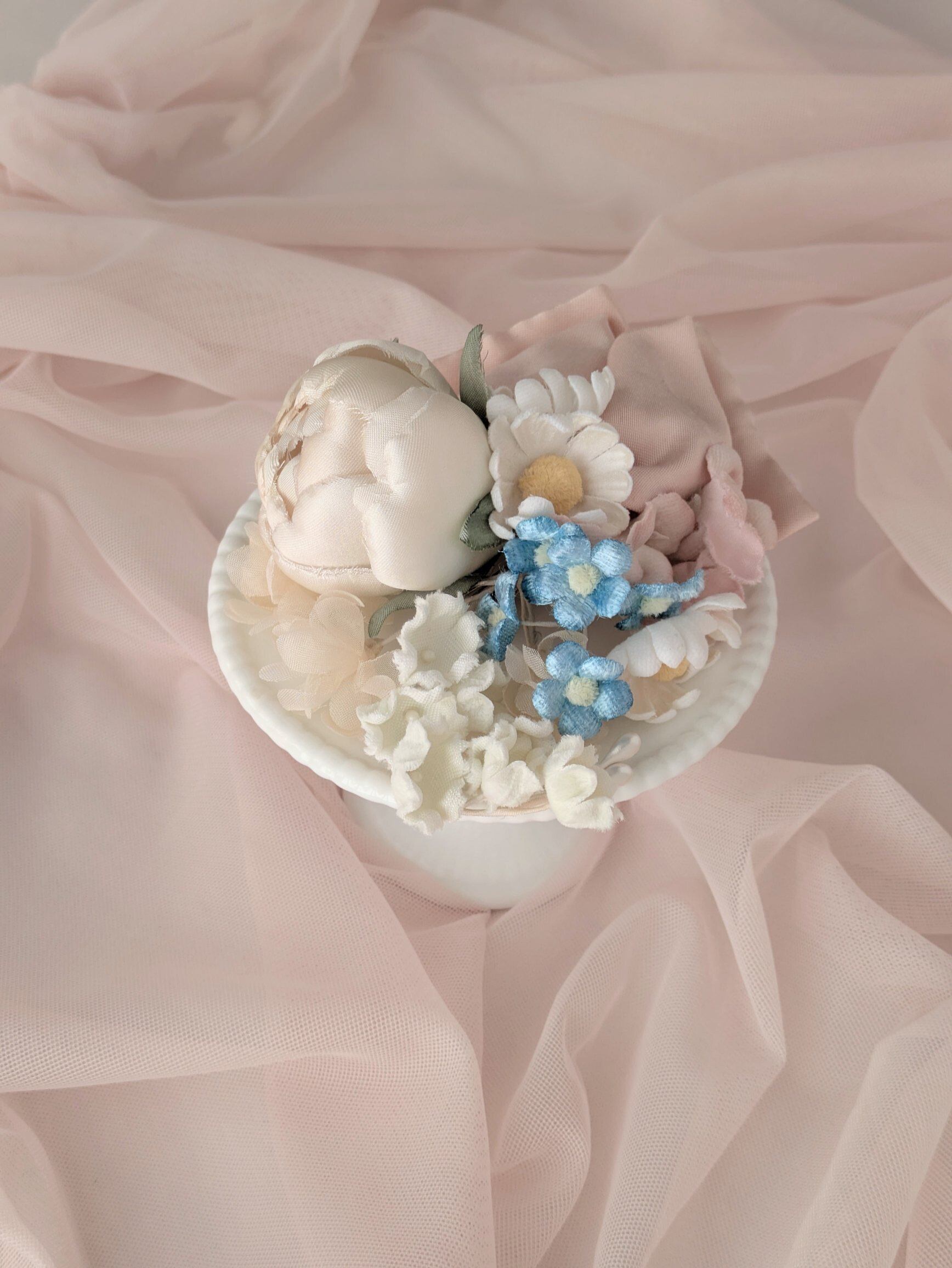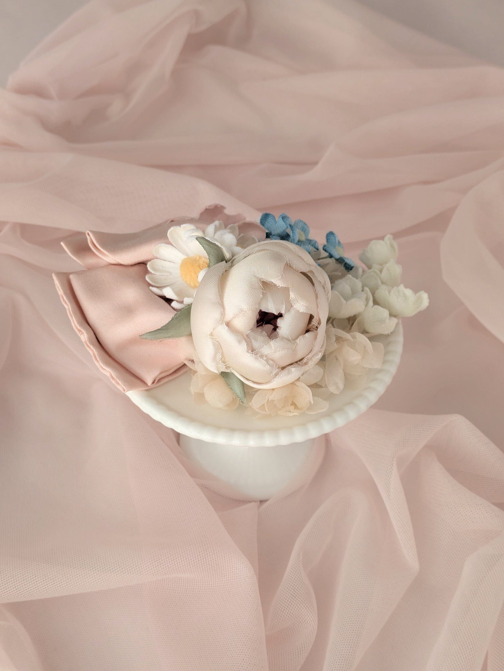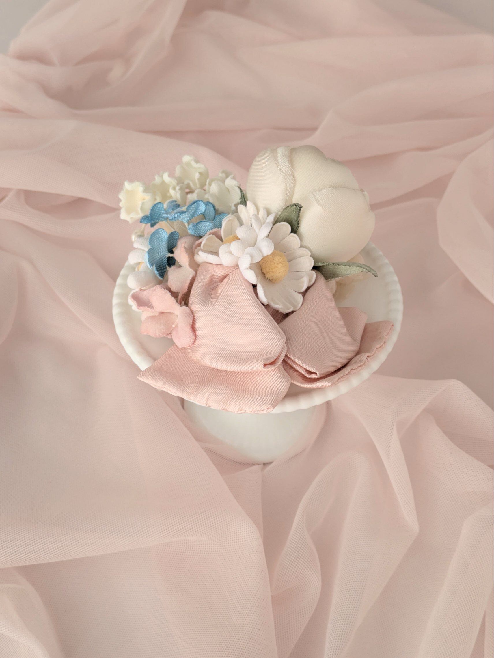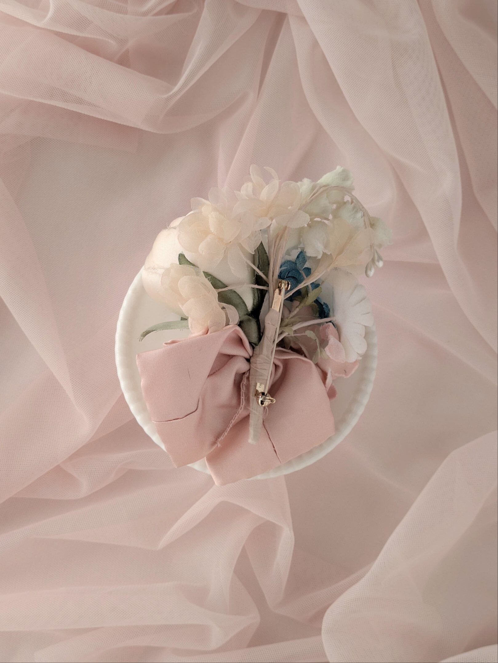 シルク生地のリボンは可愛らしくも、シックな落ち着いた印象に。花は色々な種類の布を合わせ、華やかに明るく、ロマンチックに。