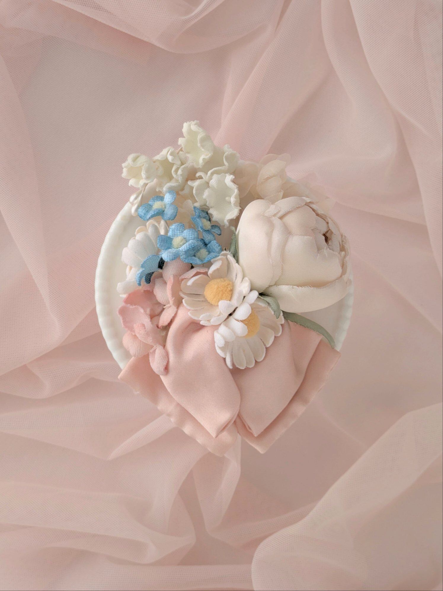 18世紀絵画の服飾にインスピレーションを得て花の様子やリボンの形を決めました。