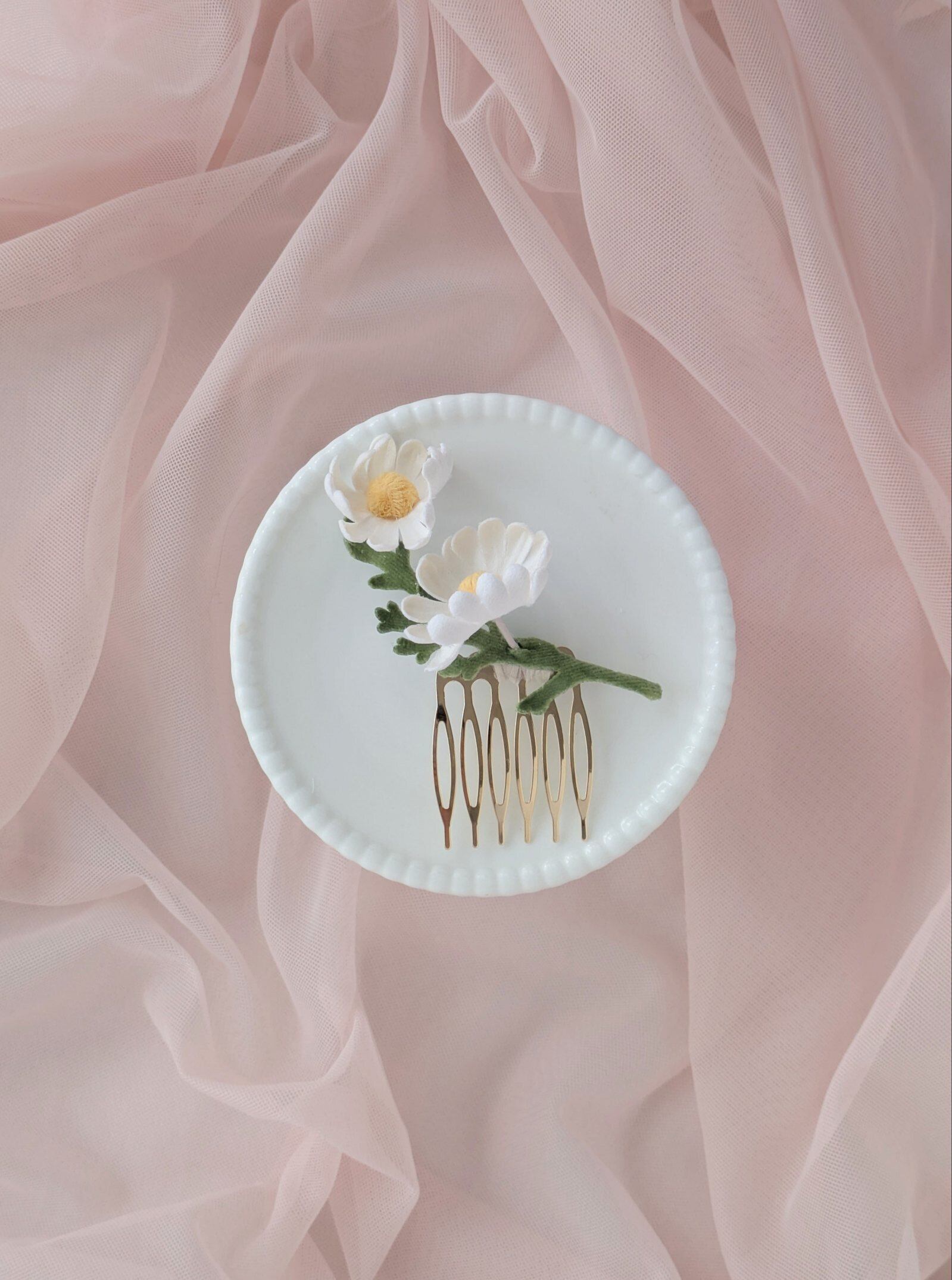 摘み取った花をそのまま髪に飾ったようなデザイン。マーガレットはシルク生地とビロードを貼りあわせています。