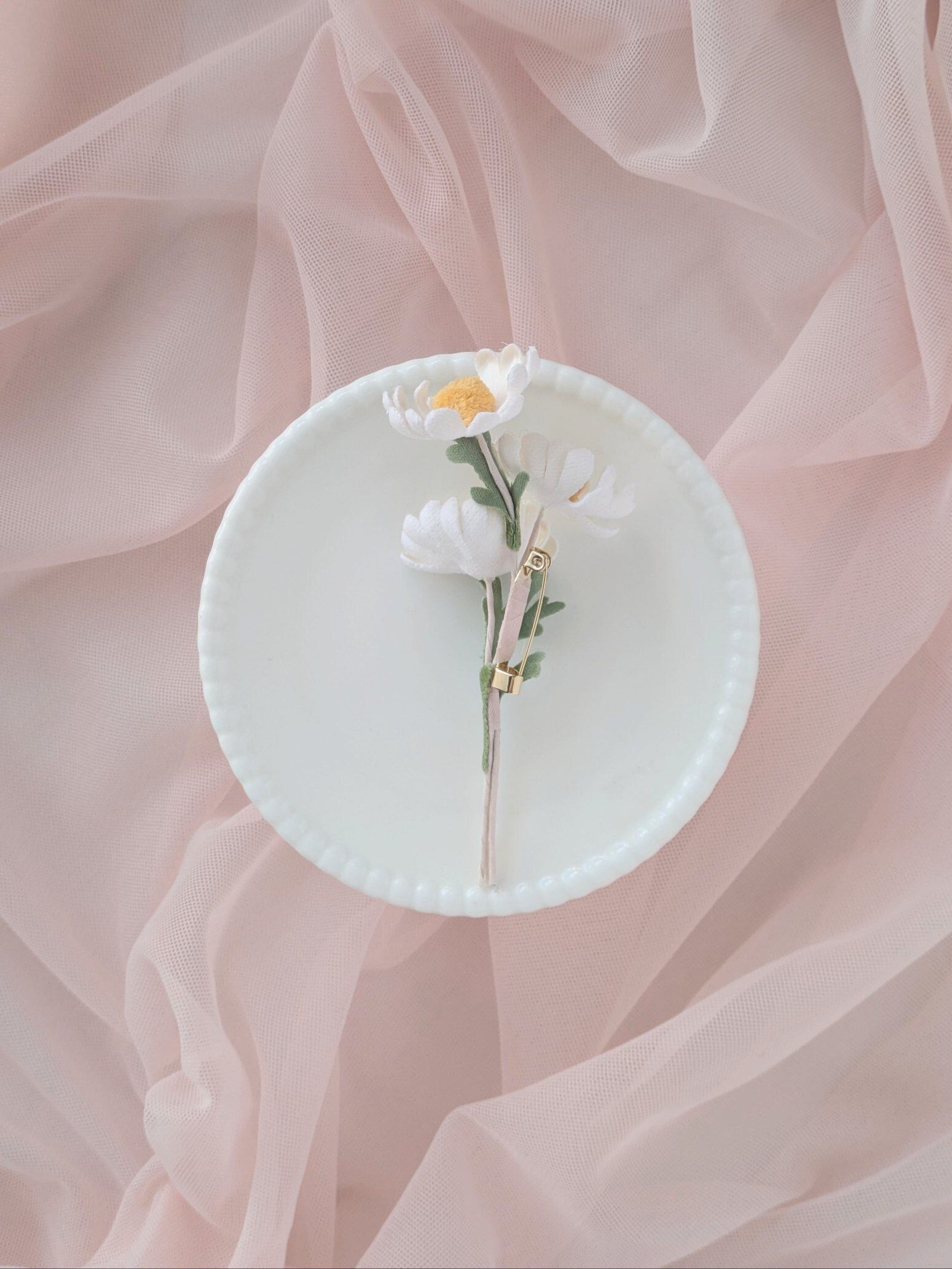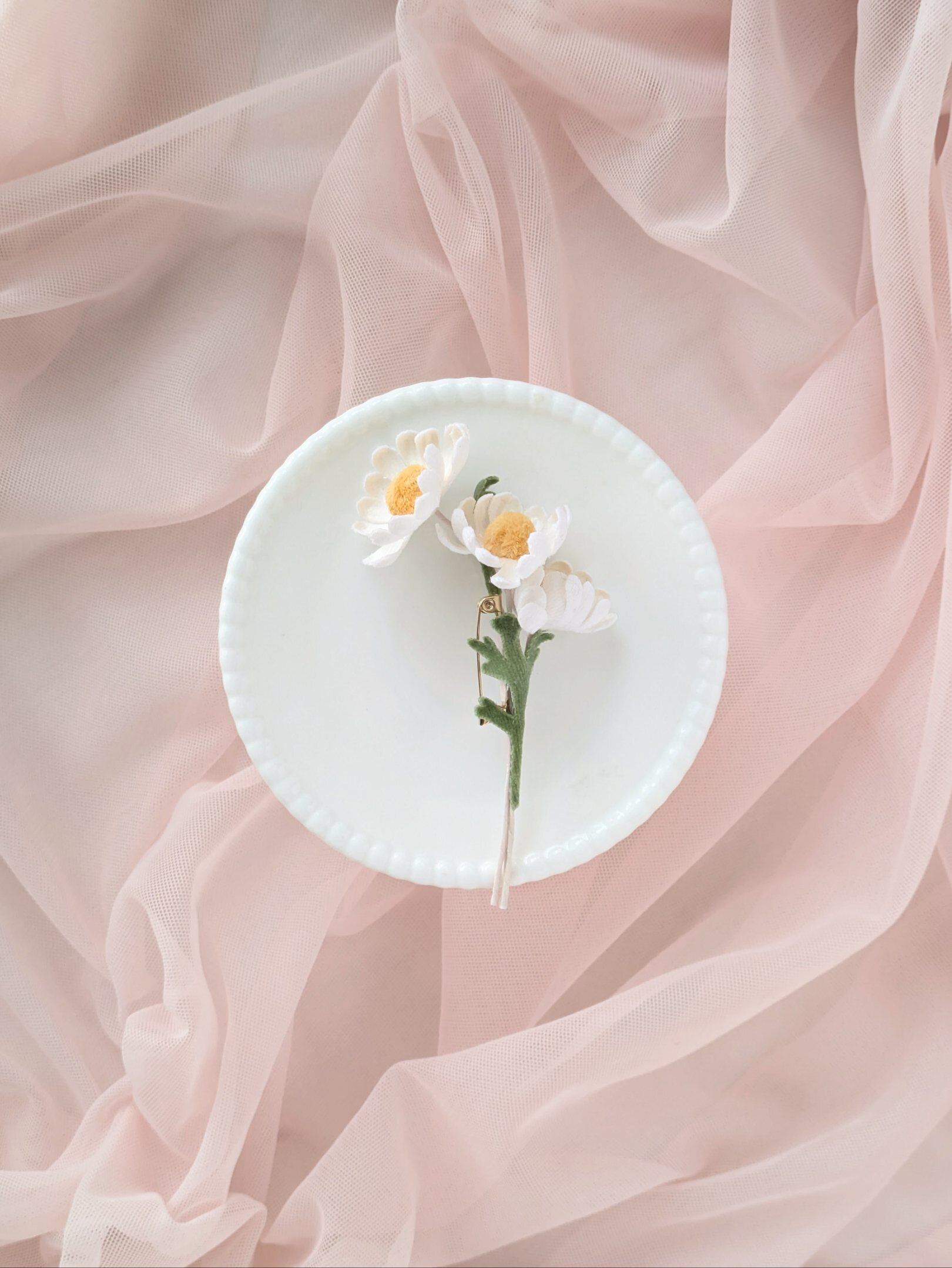 摘み取った花をそのままブローチにしたようなデザイン。マーガレットはシルク生地とビロードを貼りあわせています。