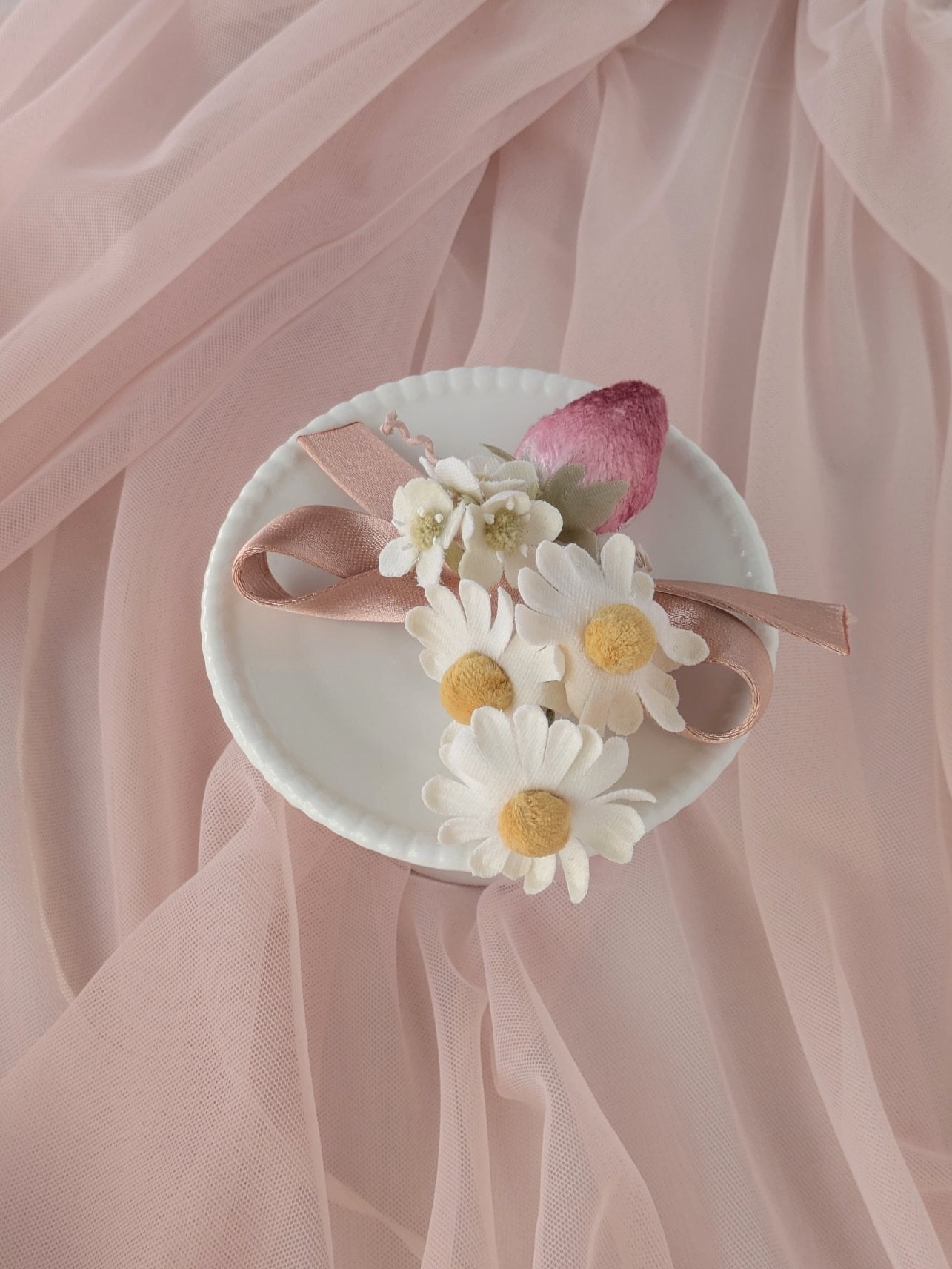 (左胸に留めた時、マーガレットがまっすぐこちらを向いているのが可愛らしく、嬉しくなります。)