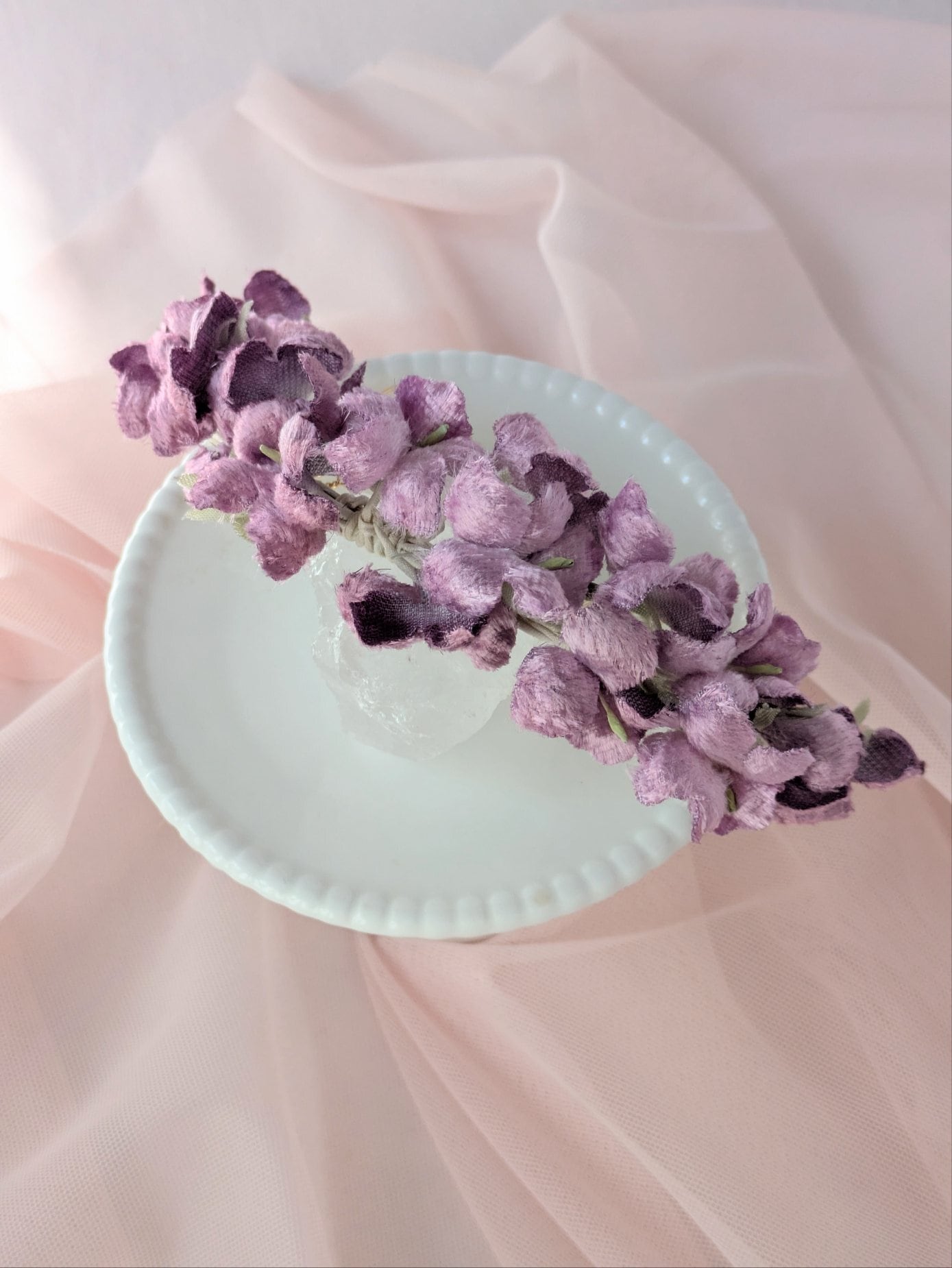 摘み取ったスミレを束ねたようなデザインの髪飾りです。生地は光沢のある毛足のあるものを使用。