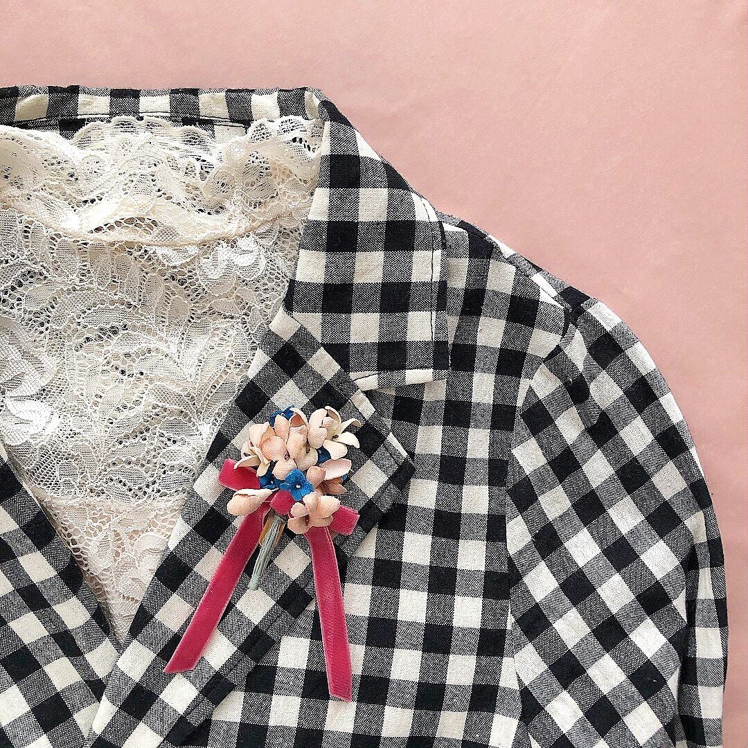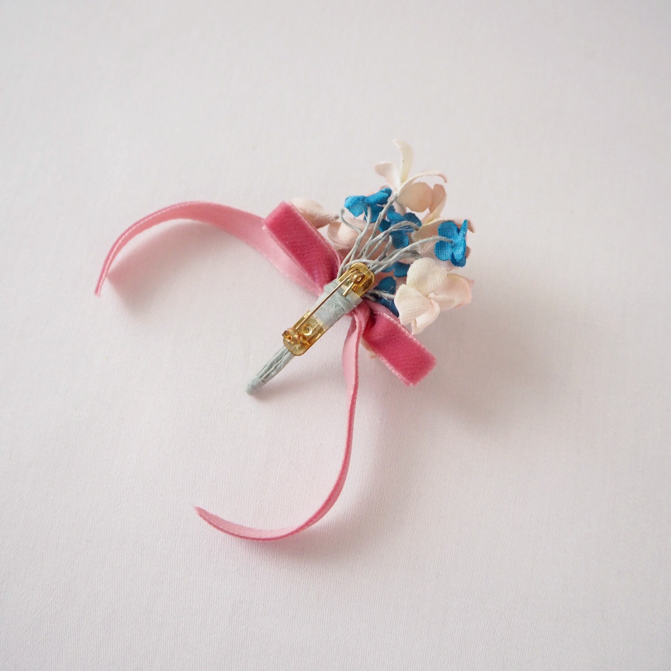 すみれの布花を、ブーケのようにリボンで飾ったブローチです。
