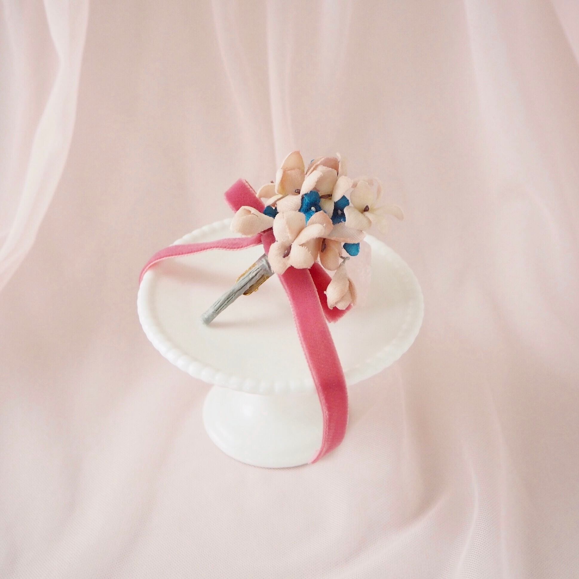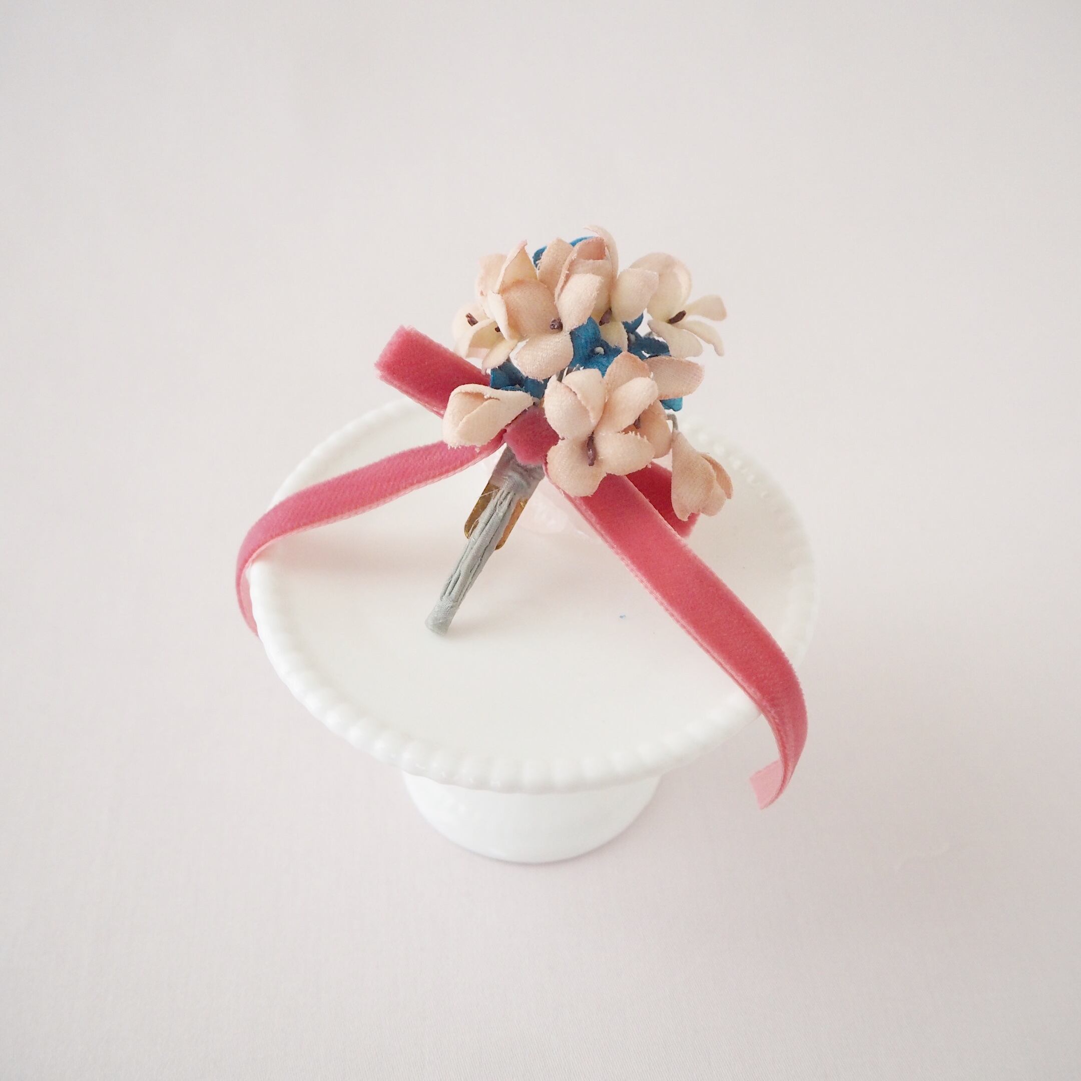 小さく可憐に咲く菫の花を、華やかなピンクのリボンでまとめました。