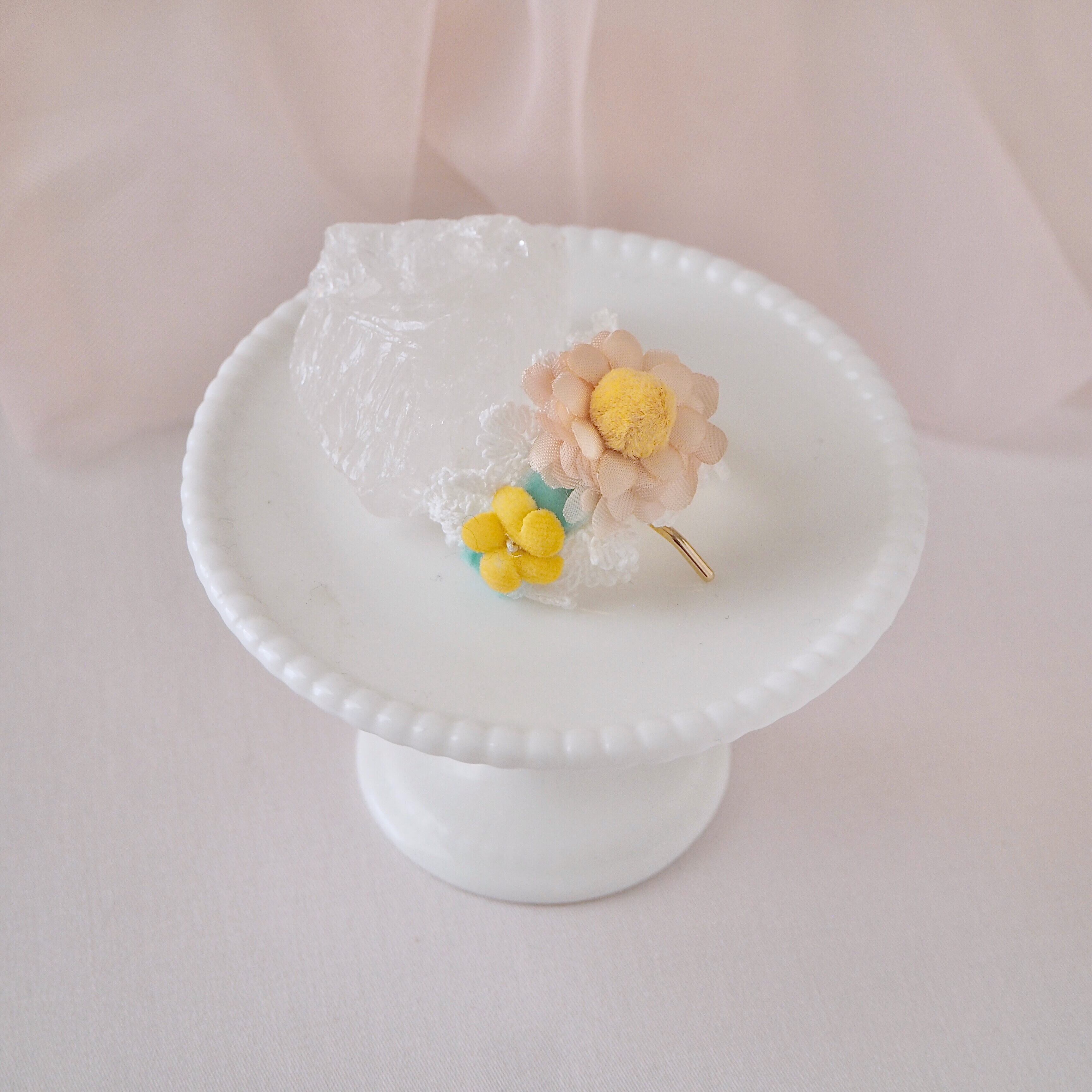 花びらを重ねたピンクのデイジーに、小花とレースを飾ったポニーフックです。
