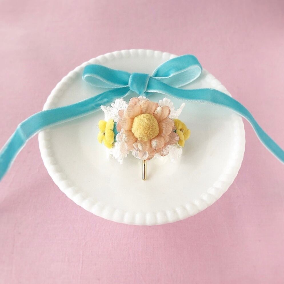 レースに水色のリボンを土台とし、ピンクと黄色の花が明るく咲いています。