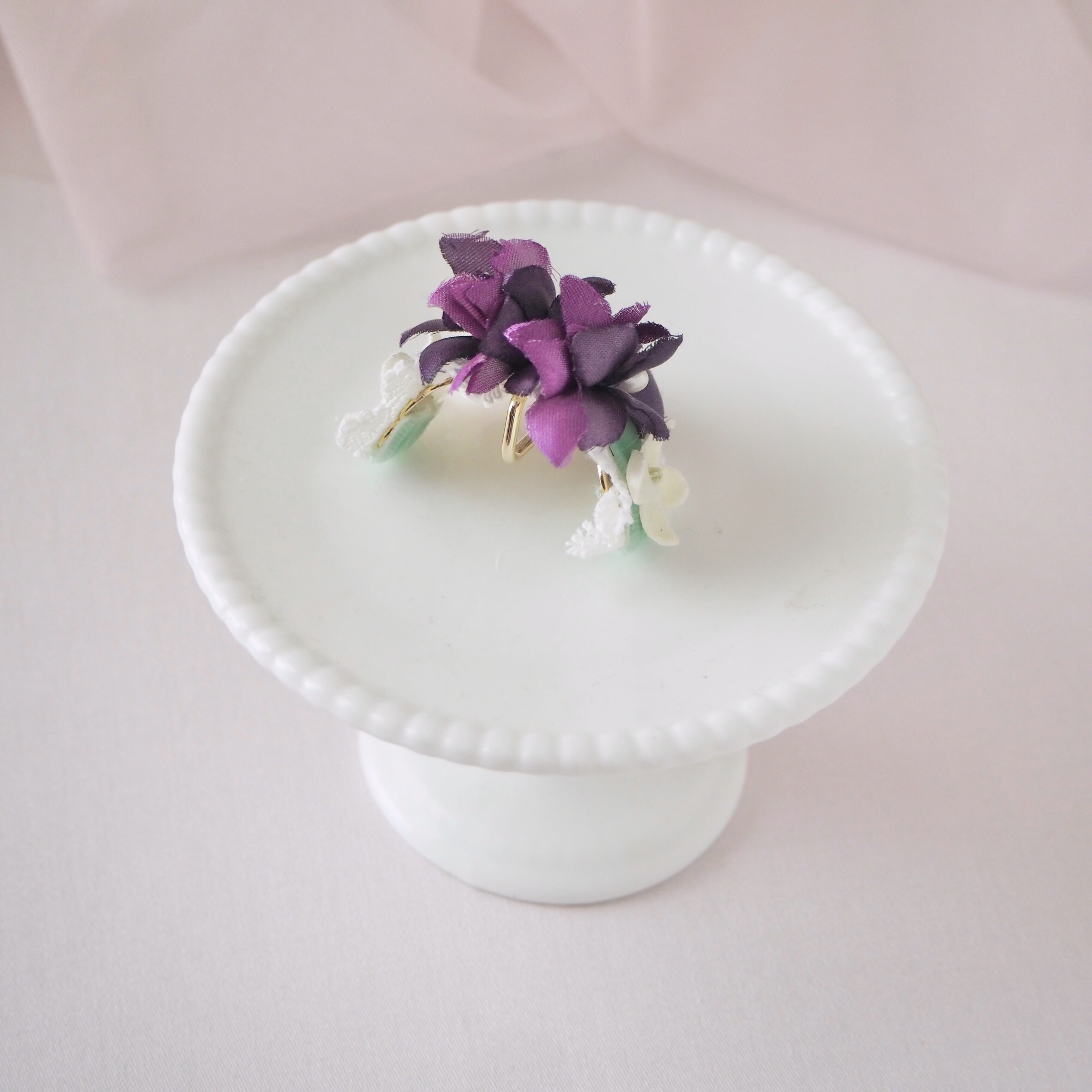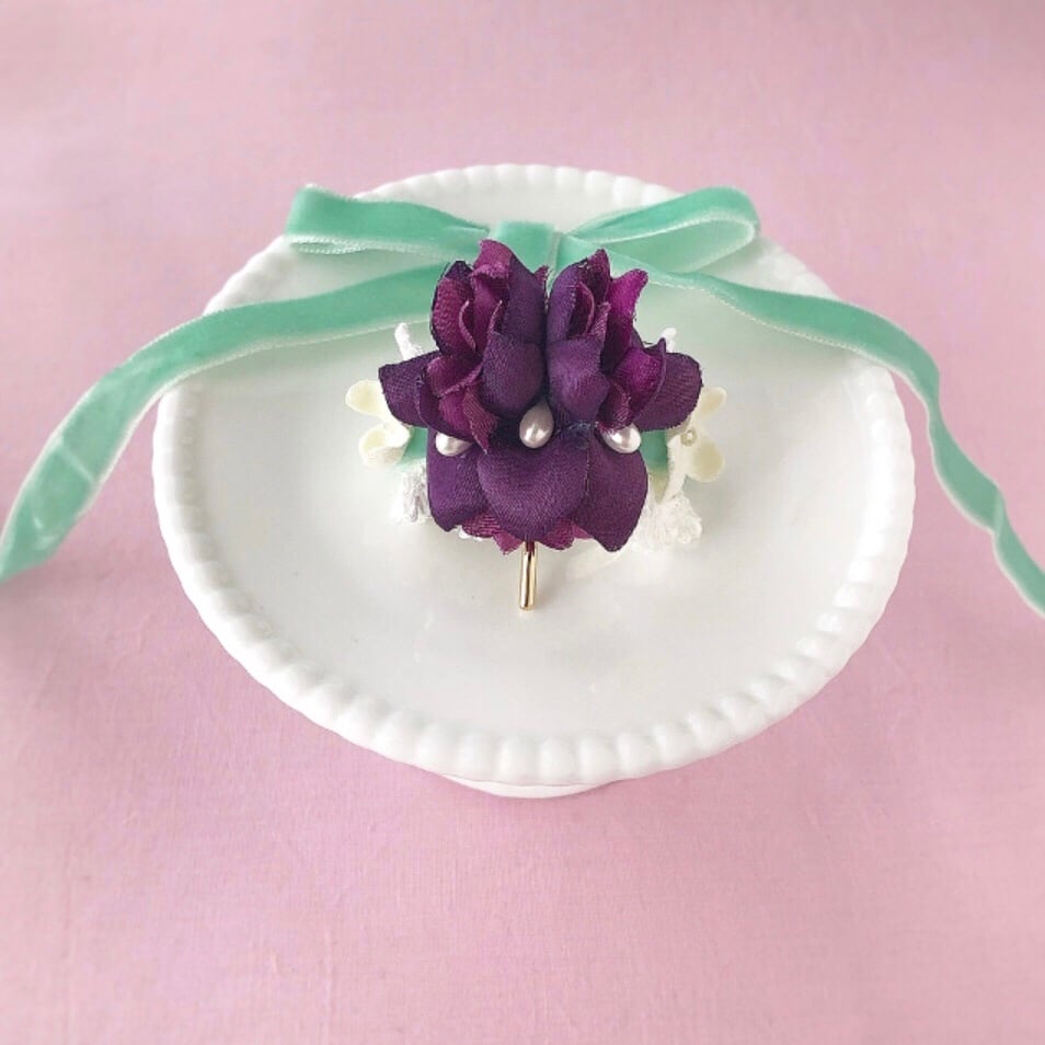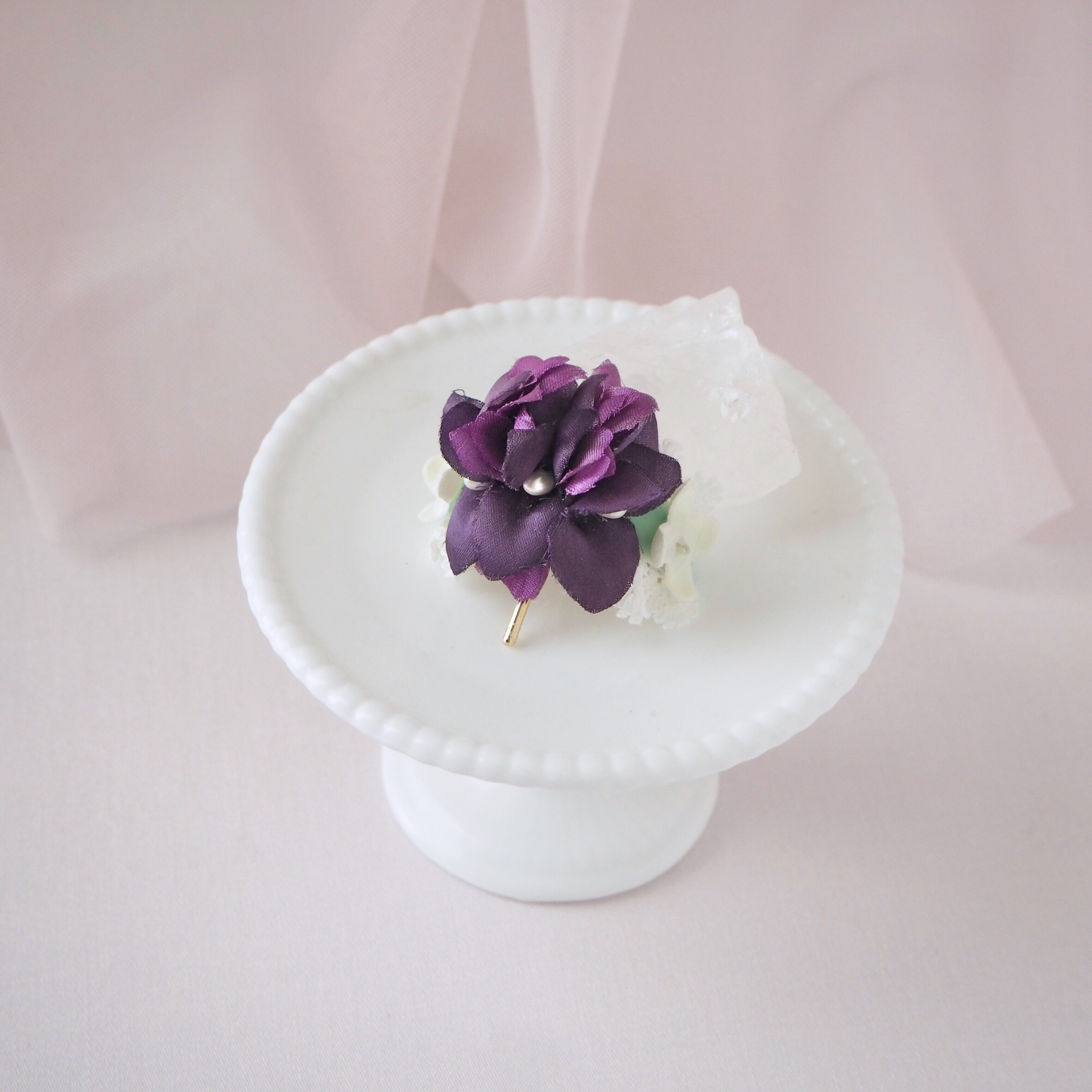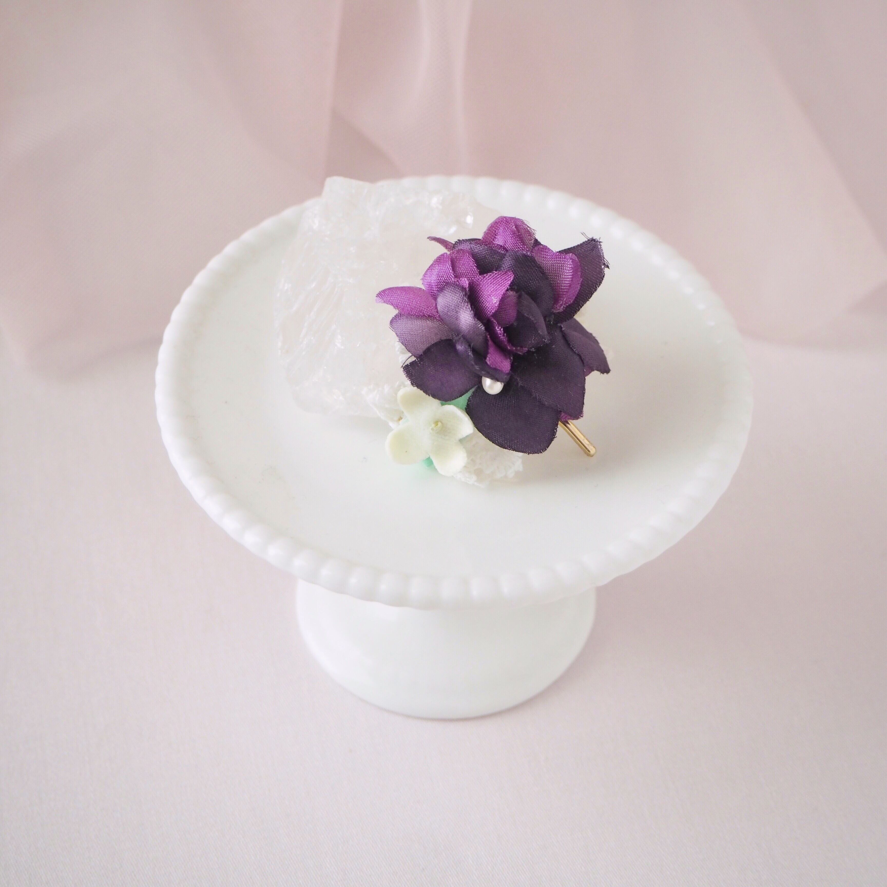 ぷっくりとツヤのあるスミレと白い小花の、華やかなポニーフックです。