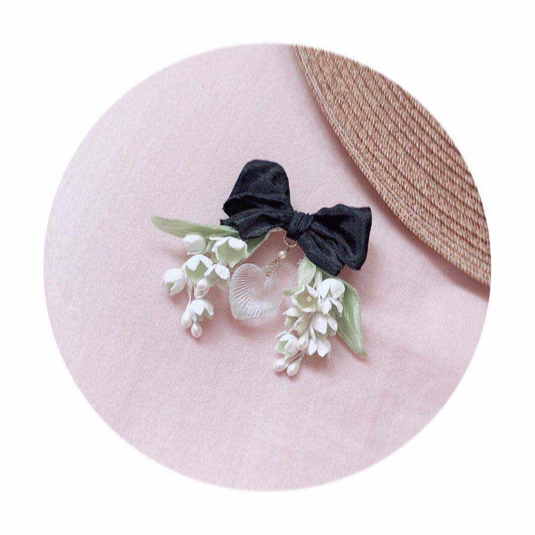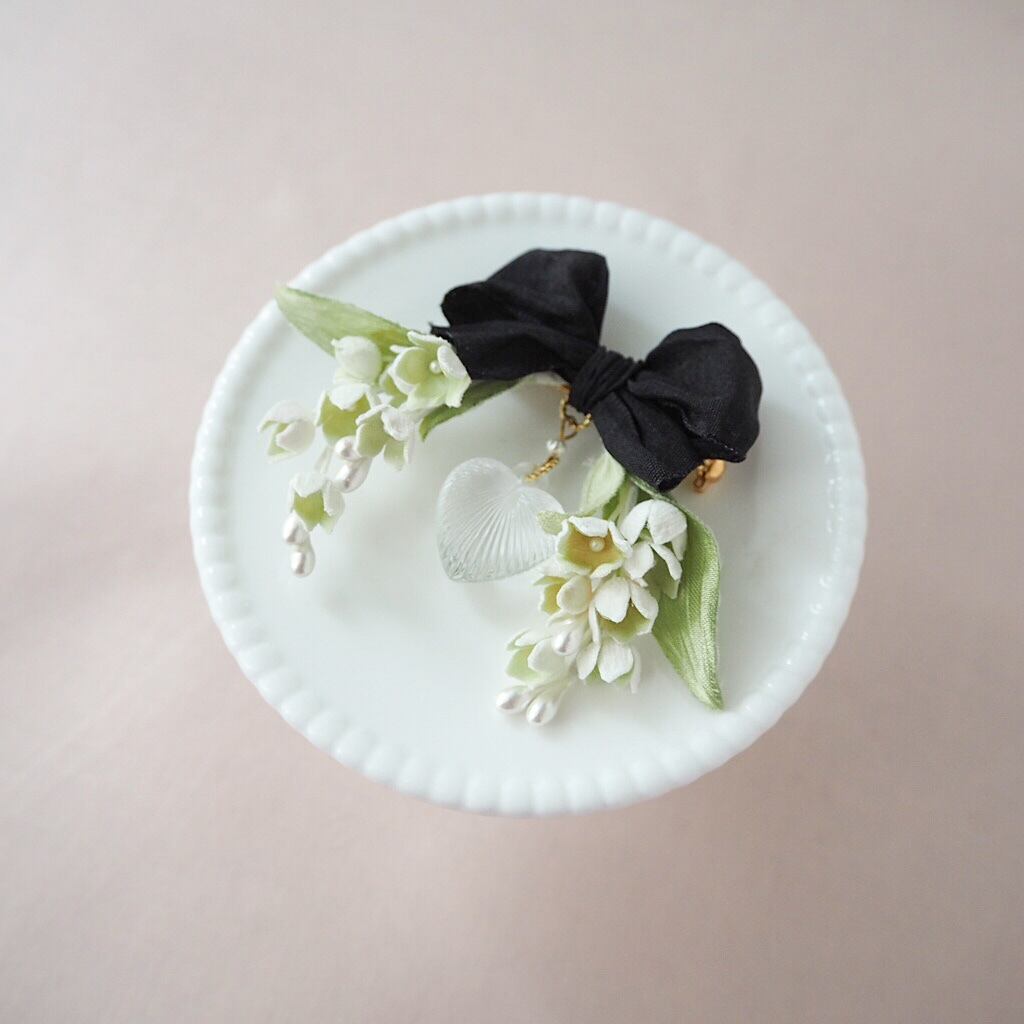 黒いリボンはワイヤー入りで立体感があり、光沢のある葉と、先端のパールペップは控えめながら華やかさがあります。ころころと咲くすずらんと、透明なハートは涼しげで清楚な印象が可愛らしいです。