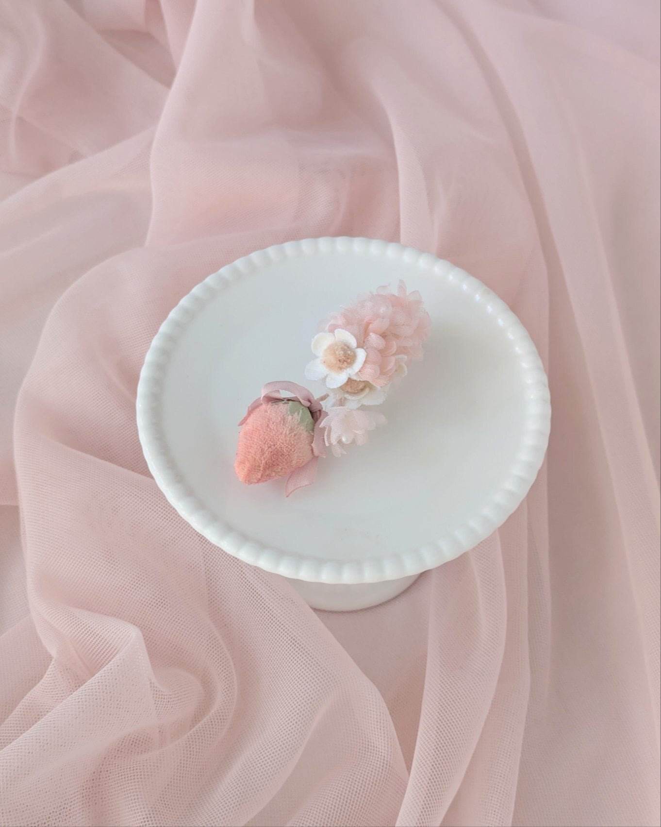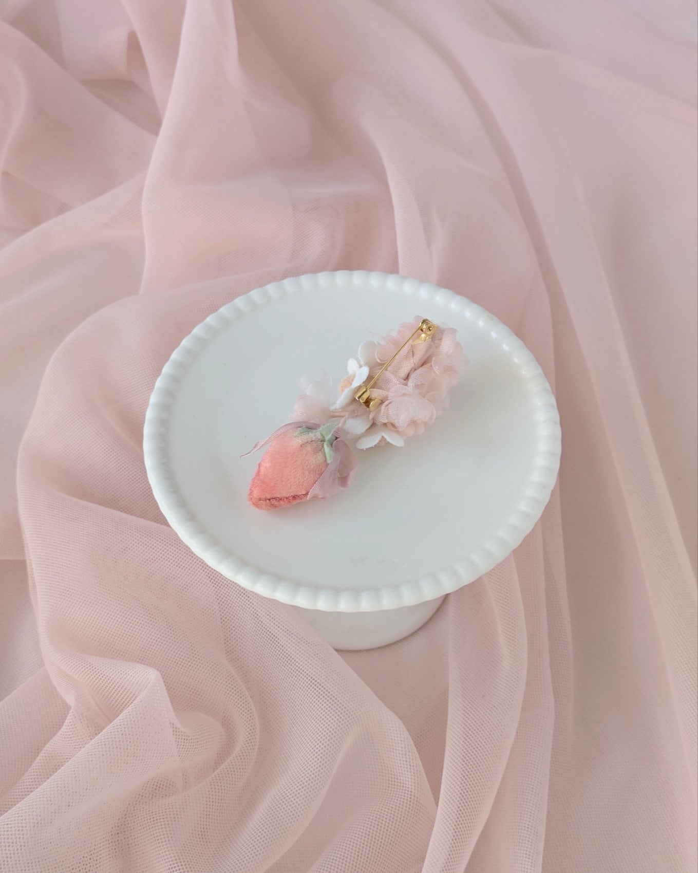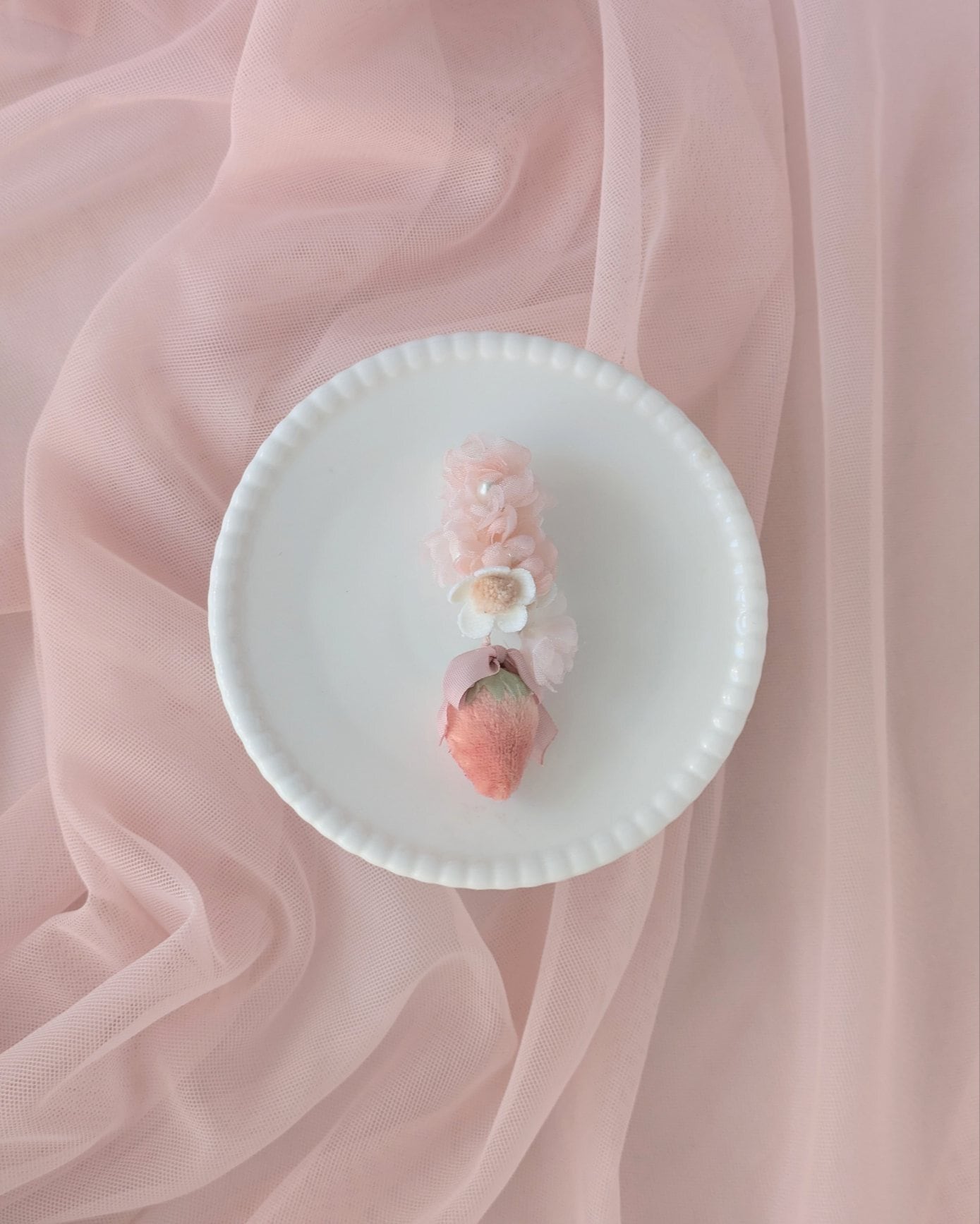 パールペップがアクセントのふわりとした小花をクリームにみたて、リボンとクリームをいちごに飾り付けるイメージのデザインです。