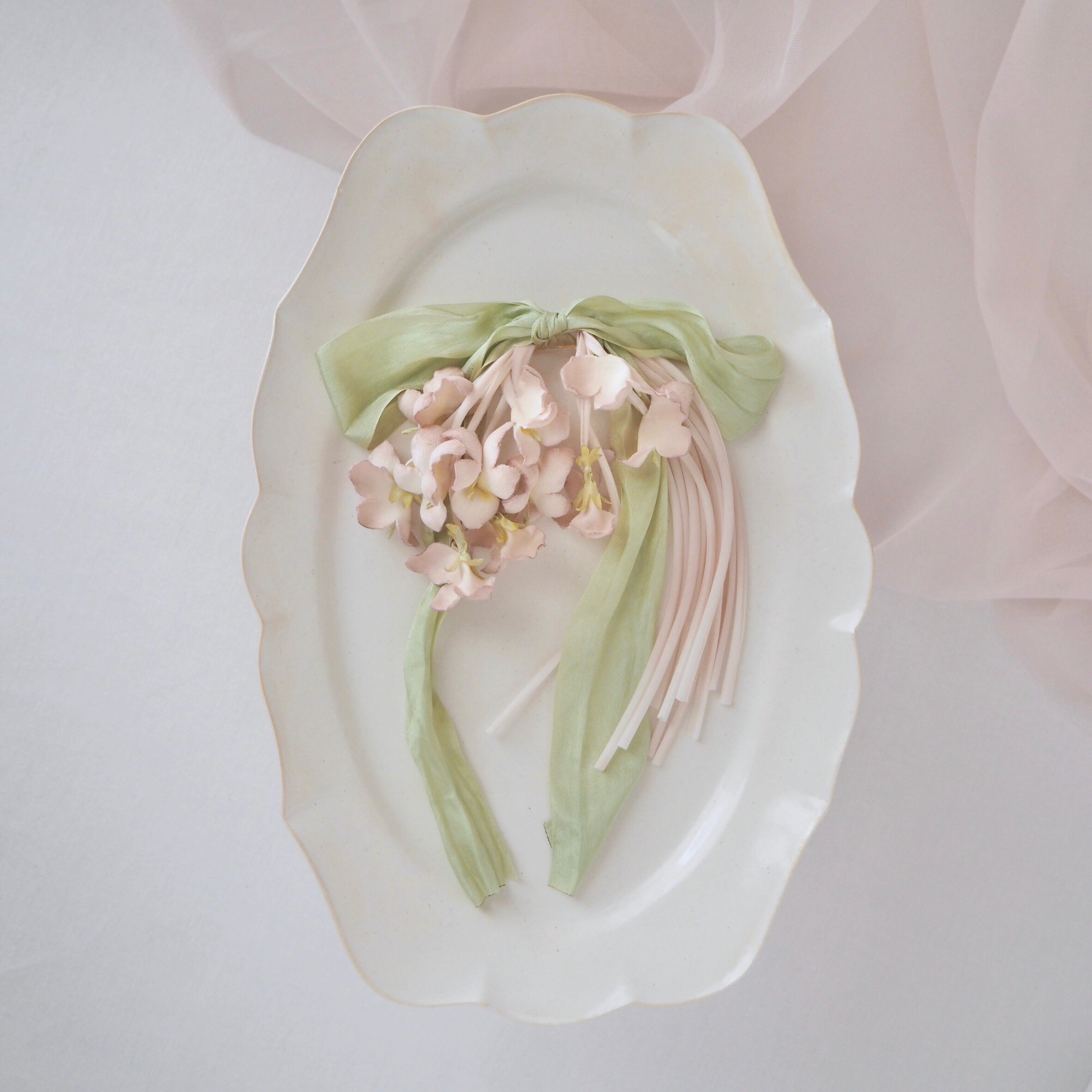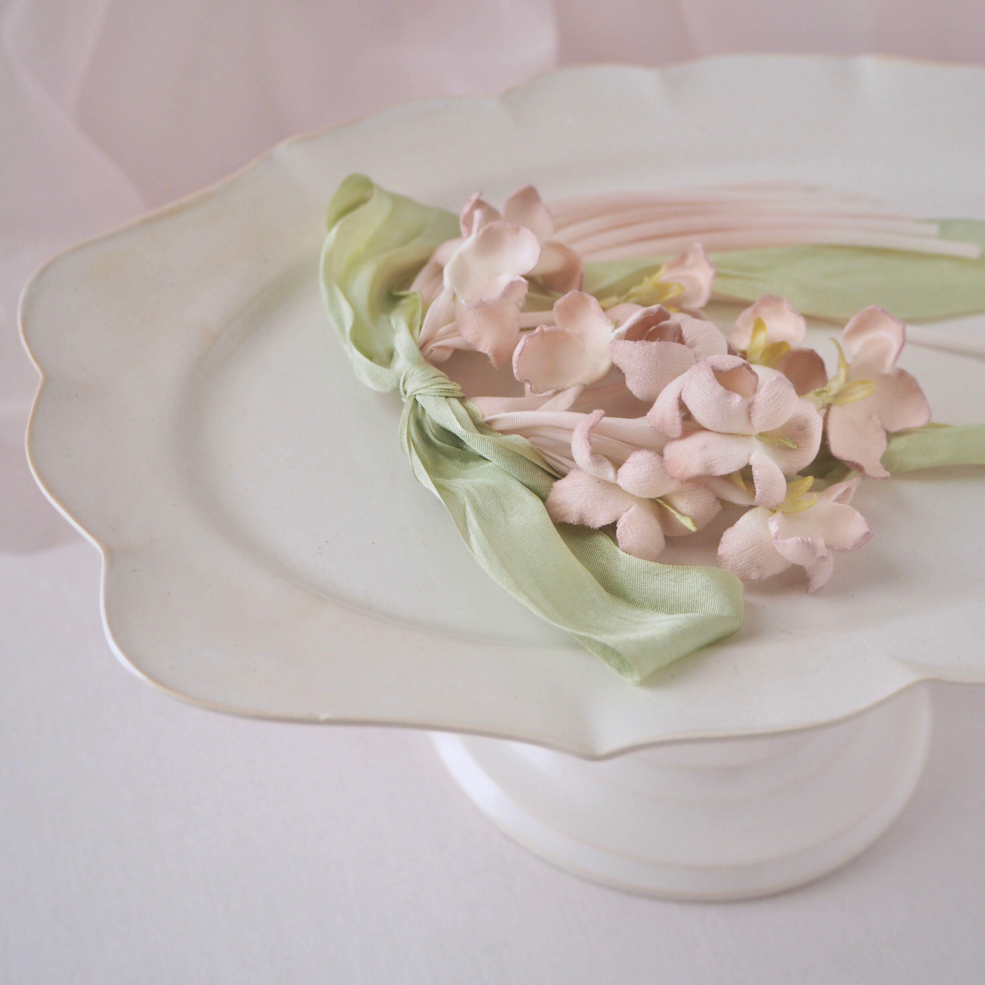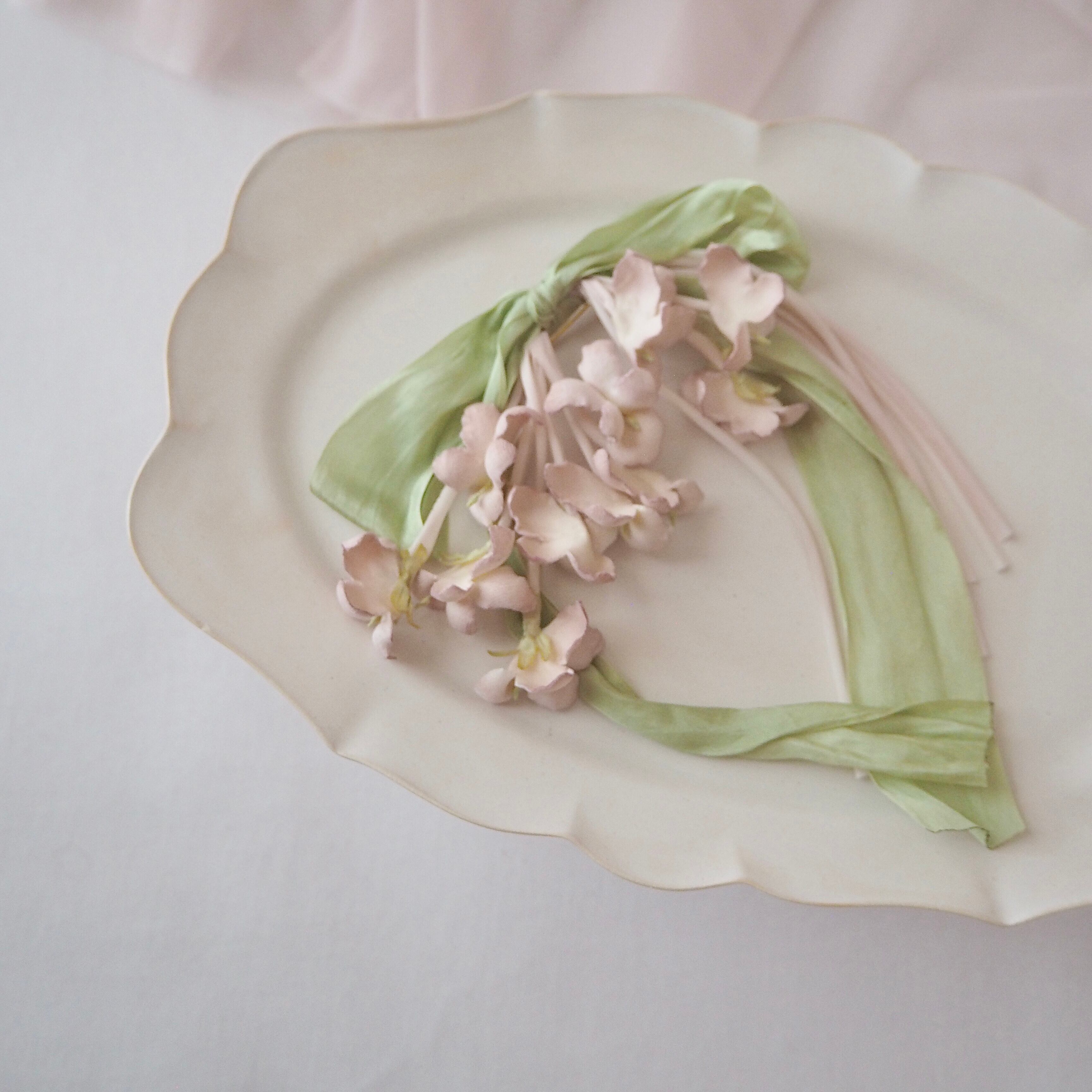 ゆれる繊細な花束を、上品な光沢のシルクリボンで束ねたコサージュです。たらんと垂れたピンクのスミレ、淡いながらも存在感があります。