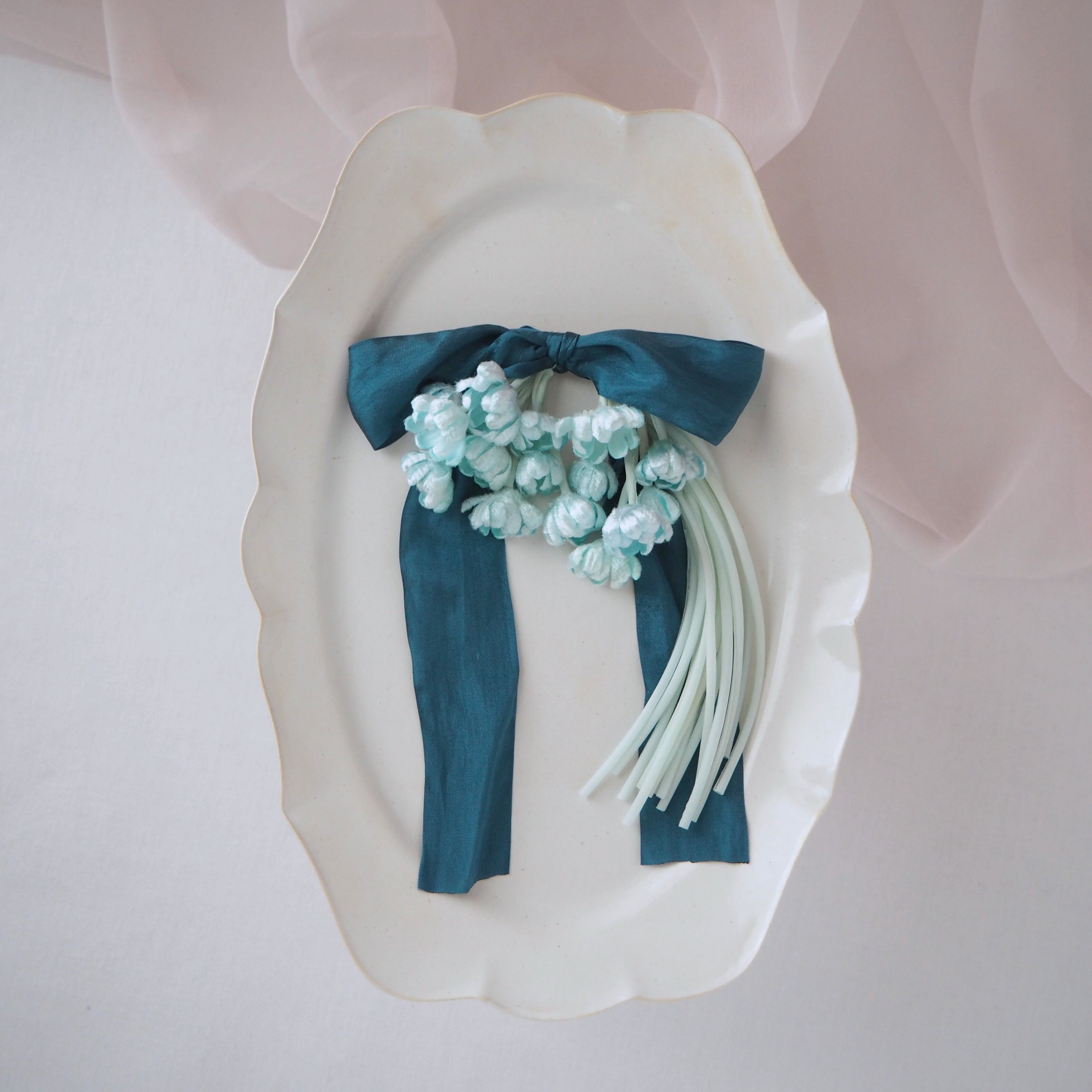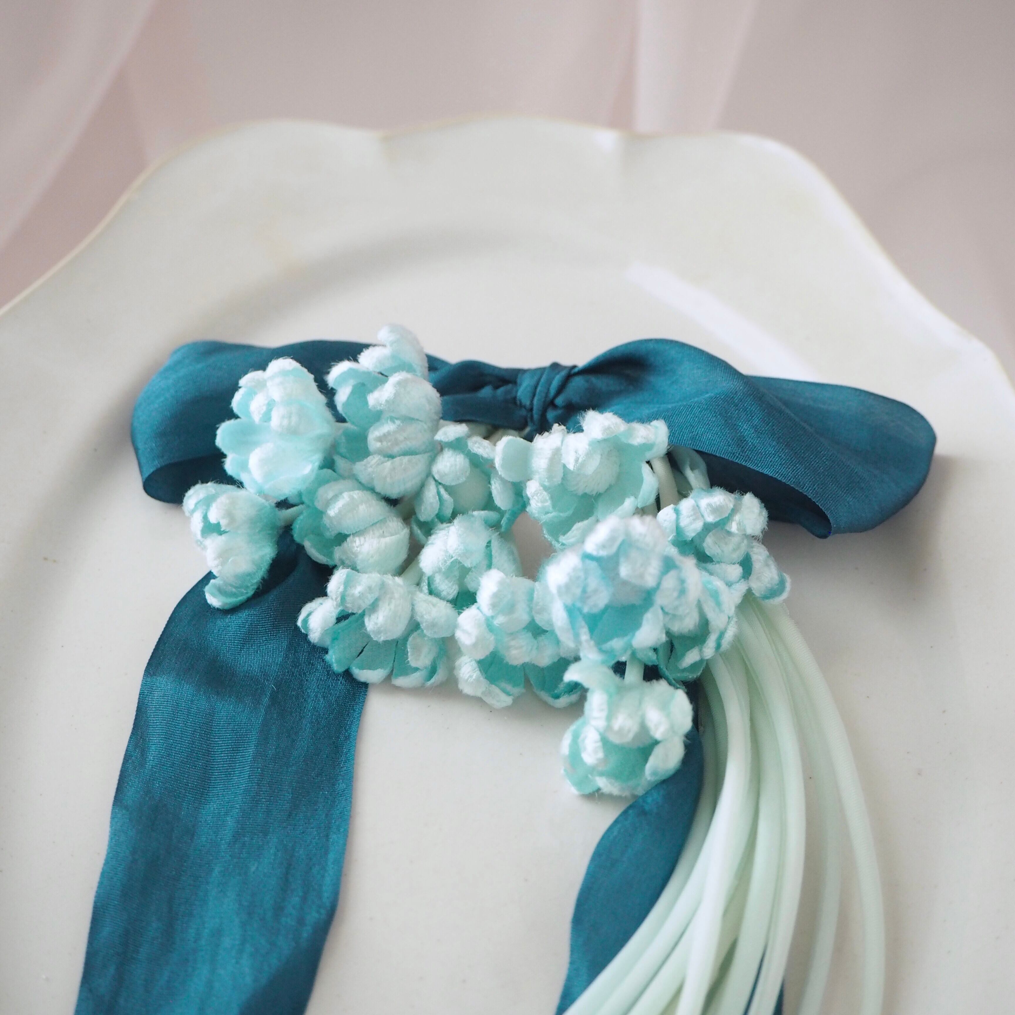 ゆれる繊細な花束を、上品な光沢のシルクリボンで束ねたコサージュです。ころんと丸いシルエットのブルーデイジー、ボリュームたっぷりに仕上げました。